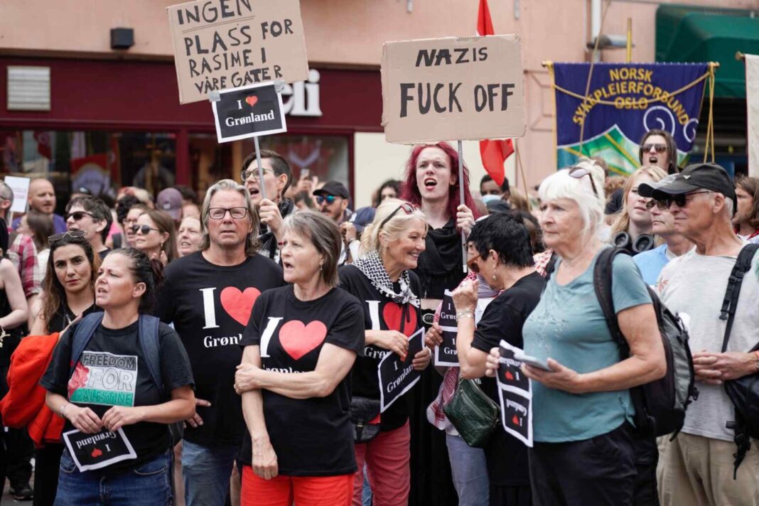 Demonstruesit, të cilët ishin kryesisht të mbështjellë me shalle palestineze, bërtitën “asnjë nazist në rrugët tona” dhe “Ne jemi të gjithë antiracistë. I gjithë Oslo i urren fashistët”.