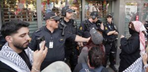 Politikania gjermane Lena Kotré nuk shihej askund në fotot e NTB-së, por protestuesit u bënë aq agresivë sa policia e gjeti më të sigurt evakuimin e grupit që po vizitonte rrugët e Grønland në Oslo. (Foto: Foto: Thomas Fure/NTB)