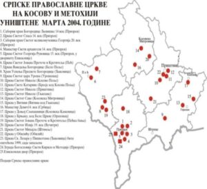Nga ky publikim po japim disa të dhëna: “Kampanja e bombardimeve të NATOS kundër Jugosllavisë dhe qeverisja lokale nga UÇK[3] e kanë rrezikuar trashëgiminë kulturore të Serbisë në Kosovë e Metohi”[4].  Gjatë luftimeve ushtarake në mes të ushtrisë Jugosllave dhe UÇK, janë dëmtuar 3 xhamia dhe 14 kulla të shqiptarëve të regjistruara si monumente kulturore, si dhe një numër i minareve të xhamive të paregjistruara si monumente kulturore, u rrëzuan. Sidoqoftë, në periudhën që nga ndërhyrja e trupave të NATO-s më 10 qershor 1999 e deri në gusht 2001, u dëmtuan këto monumente të trashëgimisë kulturore, të cilat janë klasifikuar në 4 kategori: kategoria I: 18 monumente, kategoria II: 30, kategoria III: 55 objekte të regjistruara si monumente kulturore, ku të gjitha ishin ortodokse dhe kategoria IV: 107 ndërtesa tjera të religjionit[5].