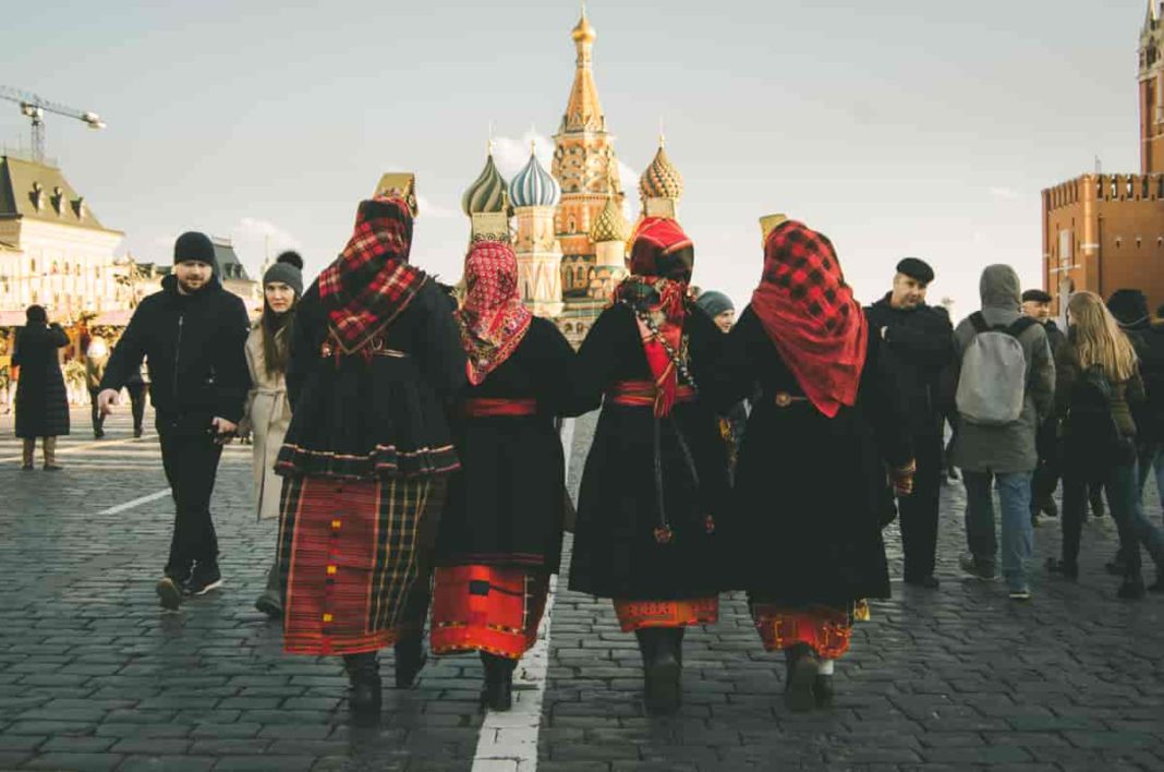 Gratë ruse me kostume popullore tradicionale voronezh, fotografuar në Sheshin e Kuq në Moskë.