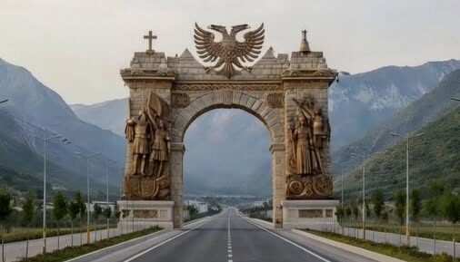Ehhh… një portë e madhe, si “kapak” krenarie, e ngritur mbi rrugë që s’pyet as për këmbë, as për mall.