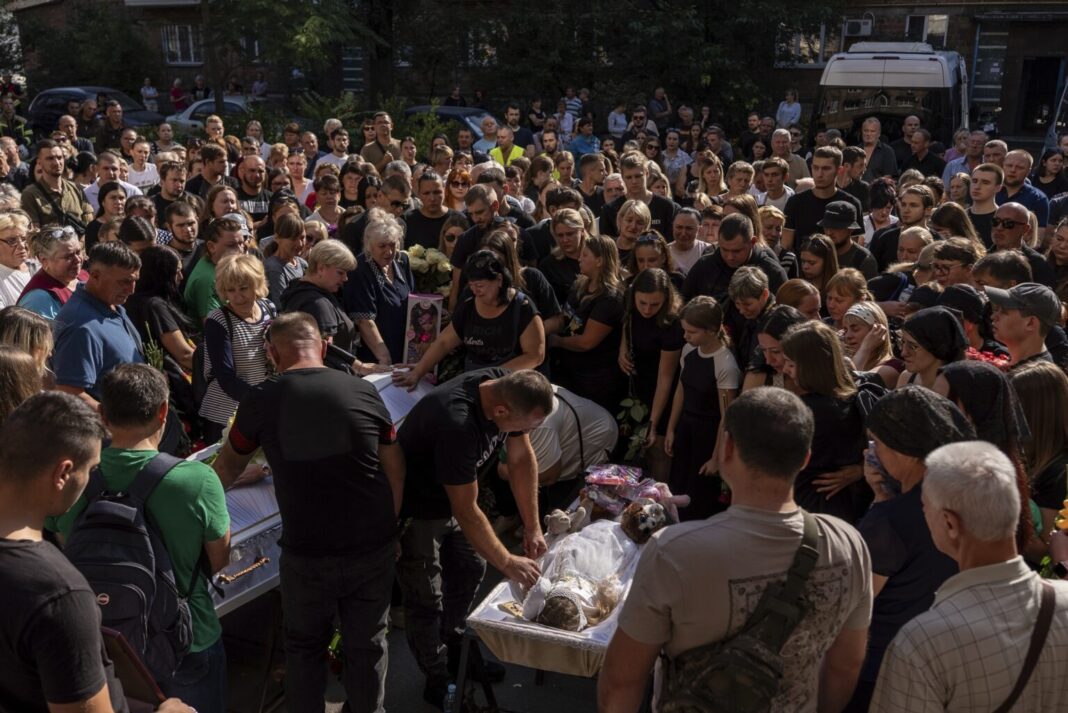 People mourn next to the coffins of Nadiia Yakymenko Galych and her 2-year-old daughter Anhelina Yakymenko Galych, killed in a recent Russian missile attack, during the funeral ceremony in their neighbourhood in Kyiv, Ukraine, Sunday, Aug. 31, 2025. (AP Photo/Alex Babenko)