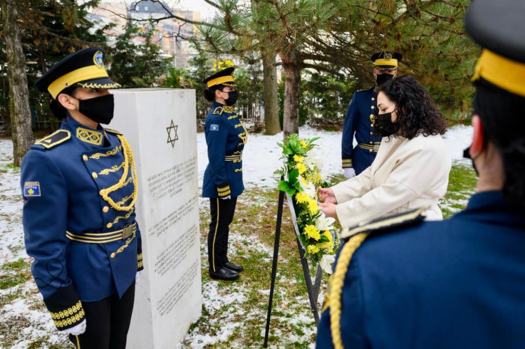Presidentja e Republikës së Kosovës, Vjosa Osmani në Ditën Ndërkombëtare të Përkujtimit të Holokaustit, bëri homazhe pranë pllakës përkujtimore për hebrenjtë që u zhdukën në kampet e nazistëve gjatë Holokaustit.