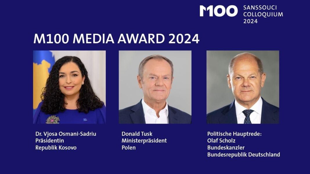 Presidentja e Republikës së Kosovës, Vjosa Osmani, është nderuar nga M100 Sanssouci Colloquium me Çmimin M100 Media Award për përkushtimin e saj ndaj vlerave euroatlantike dhe për punën e saj të palodhur në reforma, forcimin e demokracisë, kursin proevropian, luftën kundër korrupsionit, si dhe për barazinë dhe të drejtat e grave.