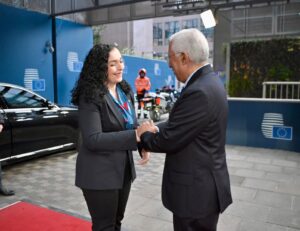 Presidentja e Republikës së Kosovës, Vjosa Osmani, në prag të Samitit BE-Ballkani Perëndimor, në Bruksel, është pritur në takim nga Presidenti i Këshillit Evropian, António Costa.