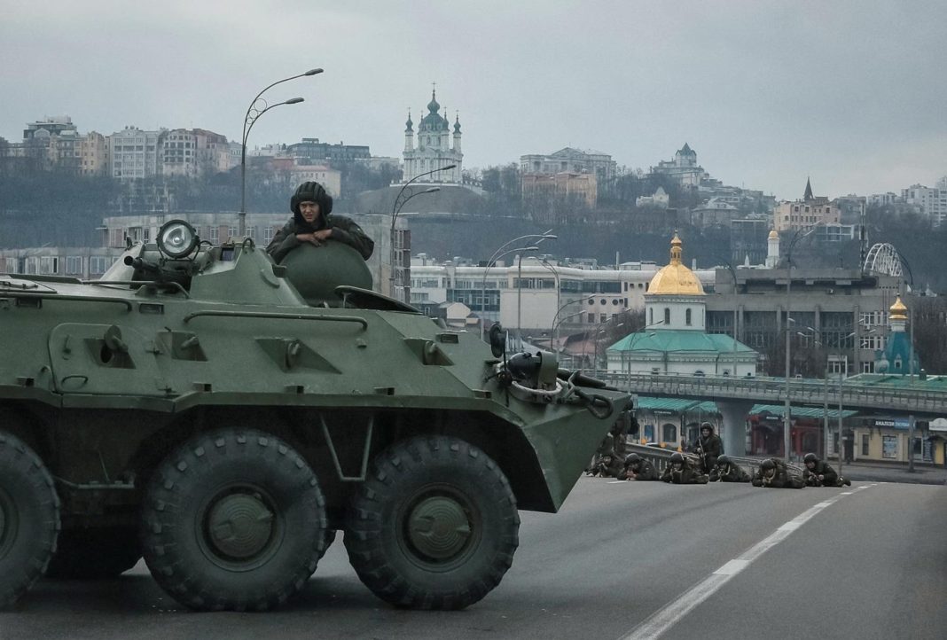 Kjo pamje tregon ushtarët ukrainas në pozicione mbrojtëse në një hyrje kryesore të qendrës së qytetit Kiev, përgjatë lumit Dnipro, rreth orës 11.30 të mëngjesit sipas orës lokale, ose 10.30 të mëngjesit me orën europiane. Qendra e qytetit Kiev është e vendosur në kreshtë, në sfond, rreth një kilometër larg. Foto: Gleb Garanich, Reuters/NTB