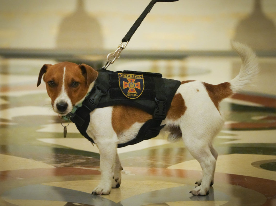 Efrem Lukatsky / AP Foto: Qeni Patron mori çmimin në Kiev të dielën.Të dielën, qeni për gjetjen dhe identifikimin e minave dhe bombave Patron mori një çmim nderi nga presidenti ukrainas Volodymyr Zelensky për përpjekjet e tij në luftë që kur Rusia pushtoi vendin në shkurt.