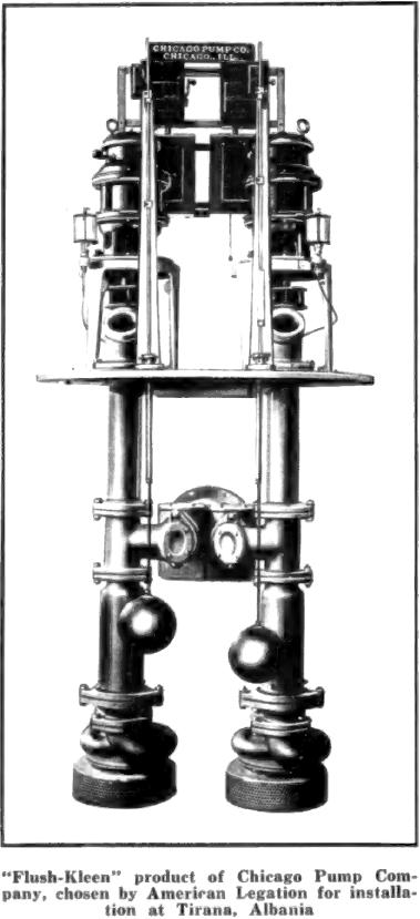Produkt “Flush-Kleen” i Chicago Pump Company, i zgjedhur nga Legata Amerikane për instalim në Tiranë, Shqipëri – Burimi : Municipal News and Water Works, shkurt 1929, f.34