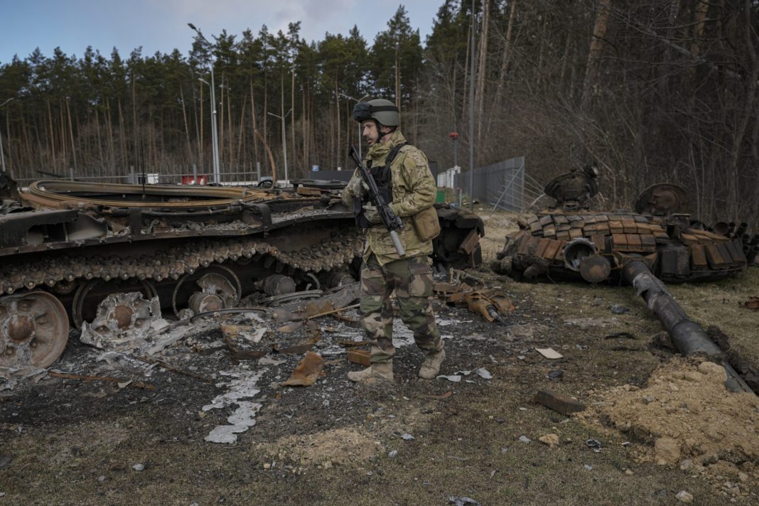 A Ukrainian serviceman walks next to the wreck of a Russian tank in Stoyanka, Ukraine, Sunday, March 27, 2022. Ukrainian President Volodymyr Zelenskyy accused the West of lacking courage as his country fights to stave off Russia’s invading troops, making an exasperated plea for fighter jets and tanks to sustain a defense in a conflict that has ground into a war of attrition. (AP Photo/Vadim Ghirda)