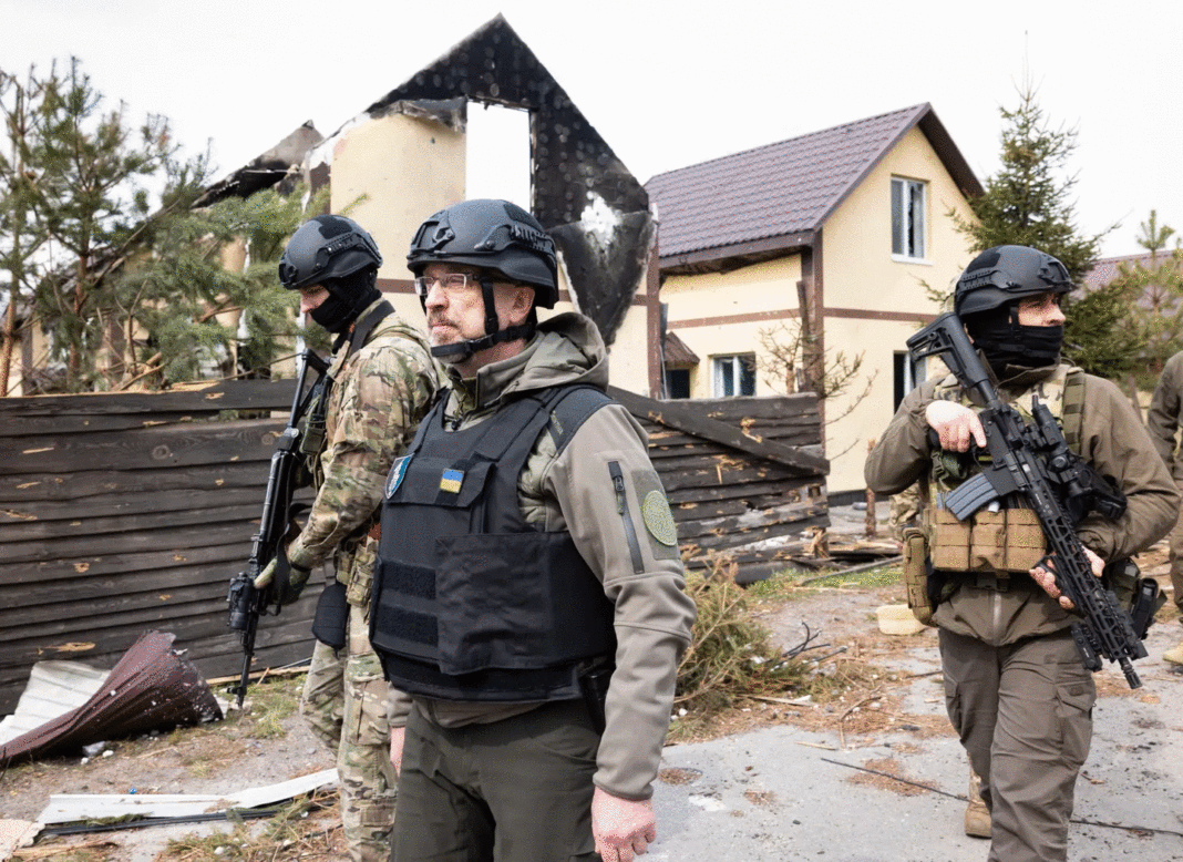 Ne qëndrojmë në fshatin Horenka ndërsa Ministri i Mbrojtjes i Ukrainës Oleksij Reznikov arrin dhe na takon.
