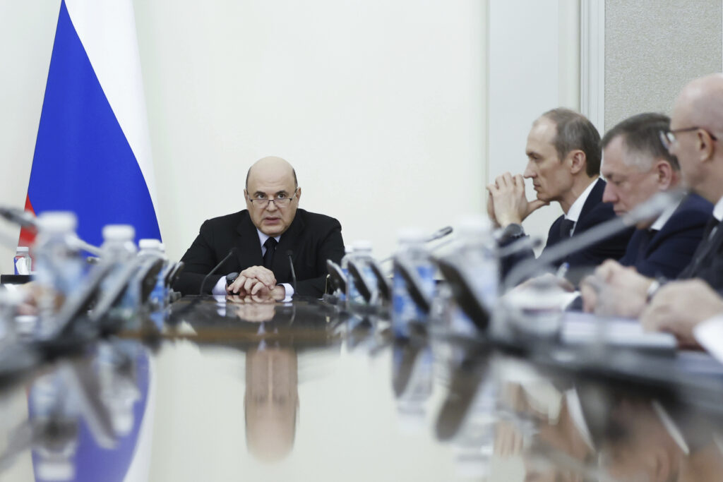 Russian Prime Minister Mikhail Mishustin leads a meeting with his deputies in Moscow, Russia, Monday, March 31, 2025. (Dmitry Astakhov, Sputnik, Government Pool Photo via AP)