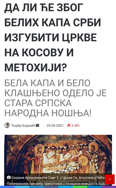përvetësimin e kishave ortodokse serbe dhe trashëgimisë tjetër etno-kulturore, ndër të tjera, përdoren imazhe historike të serbëve me kostume të bardha me fund zile dhe kapele të bardha . Mirëpo, shqiptarët nuk janë aq fajtorë, sepse luftojnë për hapësirën e nevojshme të jetesës dhe në të njëjtën kohë përdorin burime historike relevante shkencore kryesisht, e mbi të gjitha libra kapitale, vepra shkencore dhe botime të autorëve dhe studiuesve serbë. Fatkeqësisht, elita intelektuale serbe për një kohë të gjatë shkruan libra, punime shkencore dhe botime të bazuara në supozime të pasakta (ose të diktuara) shkencore dhe duke i shkaktuar dëme të mëdha korpusit kombëtar serb.”