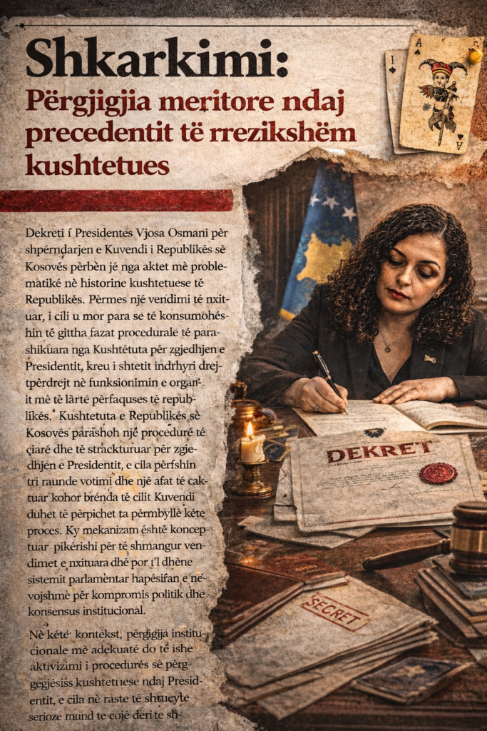 Dekreti i Presidentes Vjosa Osmani për shpërndarjen e Kuvendi i Republikës së Kosovës përbën një nga aktet më problematike në historinë kushtetuese të Republikës. Përmes një vendimi të nxituar, i cili u mor para se të konsumoheshin të gjitha fazat procedurale të parashikuara nga Kushtetuta për zgjedhjen e Presidentit, kreu i shtetit ndërhyri drejtpërdrejt në funksionimin e organit më të lartë përfaqësues të republikës.