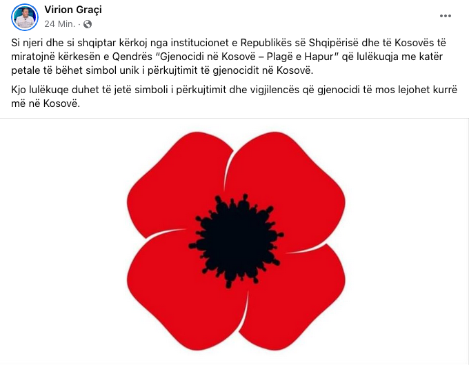 Shkrimtari i njohur Virion Graçi, kërkon që lulëkuqja me katër petale të bëhet simbol i përkujtimit të gjenocidit në Kosovë