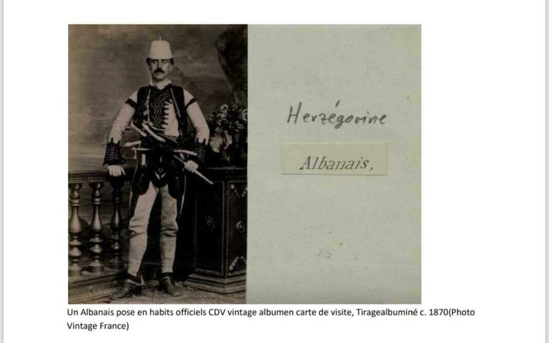 Pra një foto origjinale e shqiptarit të Krajines , nga arkiva franceze “Shqiptar në Herzegovinë, viti 1870, që paraqet veshjen e tij zyrtare, kostumin kombëtar shqiptar. (Photo Vintage France)