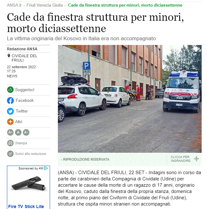 Vlenë për të theksuar se 17-vjeçari Dren Bajrami ishte i lindur në Piranë (Komuna e Prizrenit-Kosovë) më 21 nëntor të vitit 2004, i cili ishte i strehuar pranë Civiform në Cividale nga muaji Shkurt i këtij viti si i mitur i huaj dhe i pashoqëruar, siq i trajtojnë autoritetet italiane të rinjët e strehuar aty.
