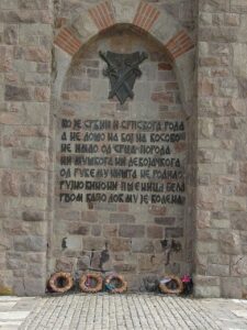 Olsi Jazexhi pranë përmedores serbe të së ashtuquajtures “beteja serbe” e Fushë-Kosovës, në Gazimestan afër Prishtinës. Thirrjes së betimit serbomadh “për me ardh në luftën e Kosovës” i bashkëngjitet edhe neoosmani i njohur me tre gishtërinjt e krenarisë serbomadhe.