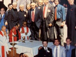 Dom Prekë Ndrevashaj, pjesëmarrës në ceremoninë përkujtimore me rastin e 45-vjetorit të persekutimeve fetare në Shqipërinë ateiste komuniste në Universitetin San Francisco të Shteteve të Bashkuara,  13-14 Prill, 1985
