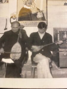 Në zyrën e Dom Prekës në Romë, (njëkohësisht edhe strehimi im si refugjat në Romë, 1970) — Dom Gjeto Radi me lahutë, Dom Preka me fyell dhe autori me çifteli, (me Dom Gjeto Radin) viti 1970.