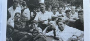 Dom Prekë Ndrevashaj, i pari majtas me një grup mërgimtarësh shqiptarë në San Biaggio, Itali, maj, 1968. Me të, në rend të parë dallohet Mr. Mckeever (Markivi, siç e thirrnin shqiptarët, Shefi irlandez i zyrës POA për mërgimtarë në Romë dhe Ndoc Vulaj. Në qendër të fotos, rapsodi popullor, Pjetër Çup Qafa duke kënduar me çifteli.