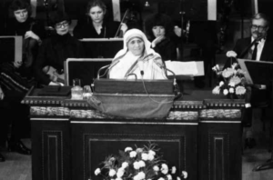 45-vjet më parë (Dhjetor, 1979) murgeshës shqiptare, Nenë Terezës iu dorëzua Çmimi Nobel për Paqe, pasi ajo ishte nderuar me këtë Çmim (më 17 tetor të vitit 1979), nga juria ndërkombëtare e Çmimit Nobel për Paqe. Nenë Tereza i foli botës nga një tribunë prej ku kanë folur personalitetet më të njohura politike dhe fushave të tjera të veprimtarive njerëzore të kësaj bote, të shekullit të kaluar.  Një “Laps i vogël në duar të Zotit”, e quante veten shpesherë Nenë Tereza, bijë e vogël e një Kombi të vogël, por me një histori të lavdishme, ndonëse edhe plot mundimesh e vuajtjesh…një bijë e Kombit shqiptar e cila duke mos njohur kufijt fetarë, etnik e kulturor, i tregoi botës se “është më kënaqësi të japësh se sa të marrësh”. Një simbol i vërtetë i bujarisë shqiptare në botë dhe shërbëtore e vërtetë e të varfërve anë e mbanë botës, pa dallim feje ose origjine. E si mos ta kujtojmë këtë “mrekulli për të gjithë, këtë lajmëtare, guximtare të dashurisë, shembull gjithmonë aktual i zbulimit, se çdo njeri është vëllai ynë”, do të deklaronte Papa Pali i VI për të përvuajturën Nenë Terezën shqiptare, motrën e madhe dhe të vogël tonën.