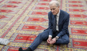 Kryeministri Jonas Gahr Støre (Ap) viziton xhaminë Rabita në Oslo për t’u takuar me të rinjtë myslimanë dhe një familje për të diskutuar përvojat e tyre mbi situatën në Lindjen e Mesme më 26 shkurt 2025. Støre administron Norvegjinë, por a e mbron ai vërtet Norvegjinë? Foto: Javad Parsa / NTB.