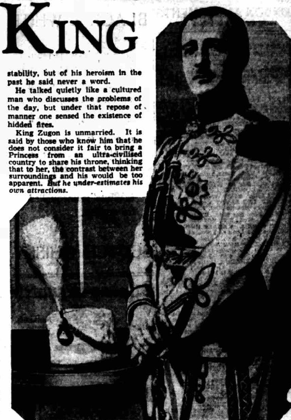 Mbreti Zog është beqar. Ata që e njohin thonë se ai nuk e konsideron të drejtë të sjellë një princeshë nga një vend ultra i civilizuar për të ndarë fronin e tij, duke menduar se për të kontrasti midis saj dhe atij do të ishte shumë i dukshëm. Por ai i nënvlerëson tërheqjet e tij.