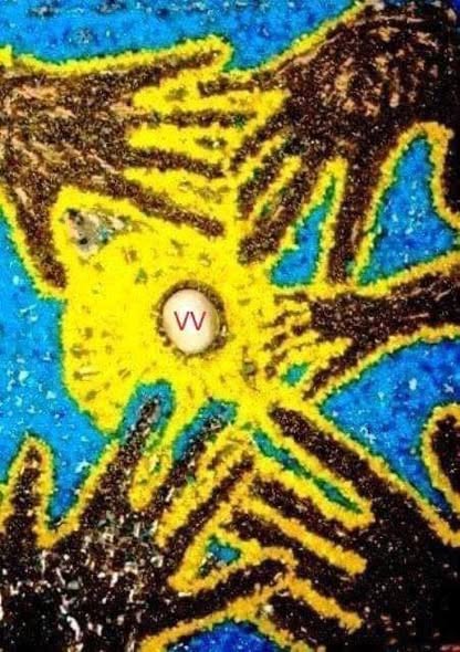Në mozaikun e shpresës, pesë duar prekin një dritë të vetme me inicialet VV.